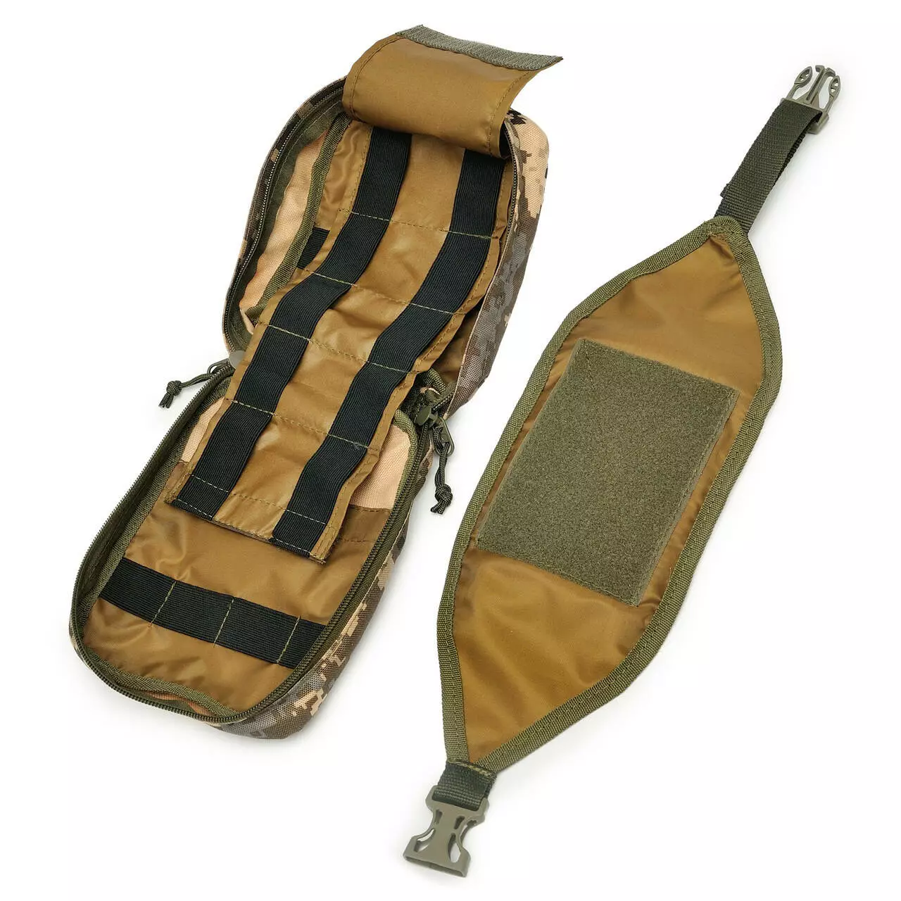 На верхній частині аптечки розміщені кріплення MOLLE. Застібається